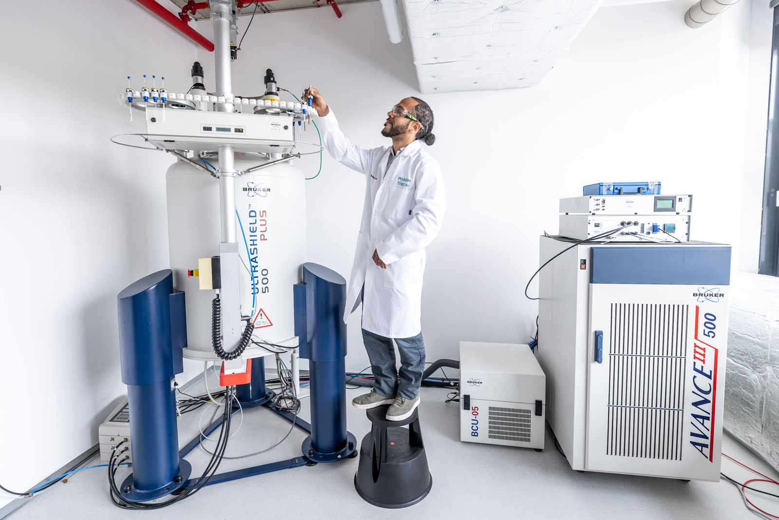 Pomocí NMR spektroskopie vědci v PharmTheonu zkoumají, jak přesně vypadají a fungují molekuly s potenciálem stát se novými léky. Na snímku Mbilo Misehe.