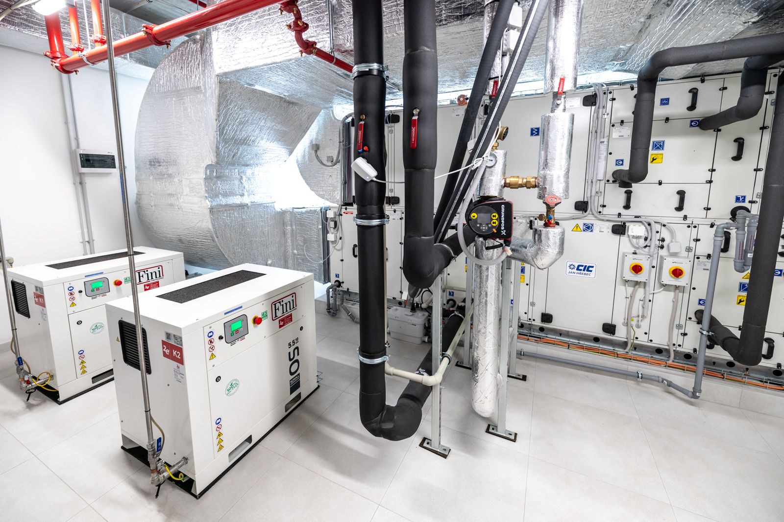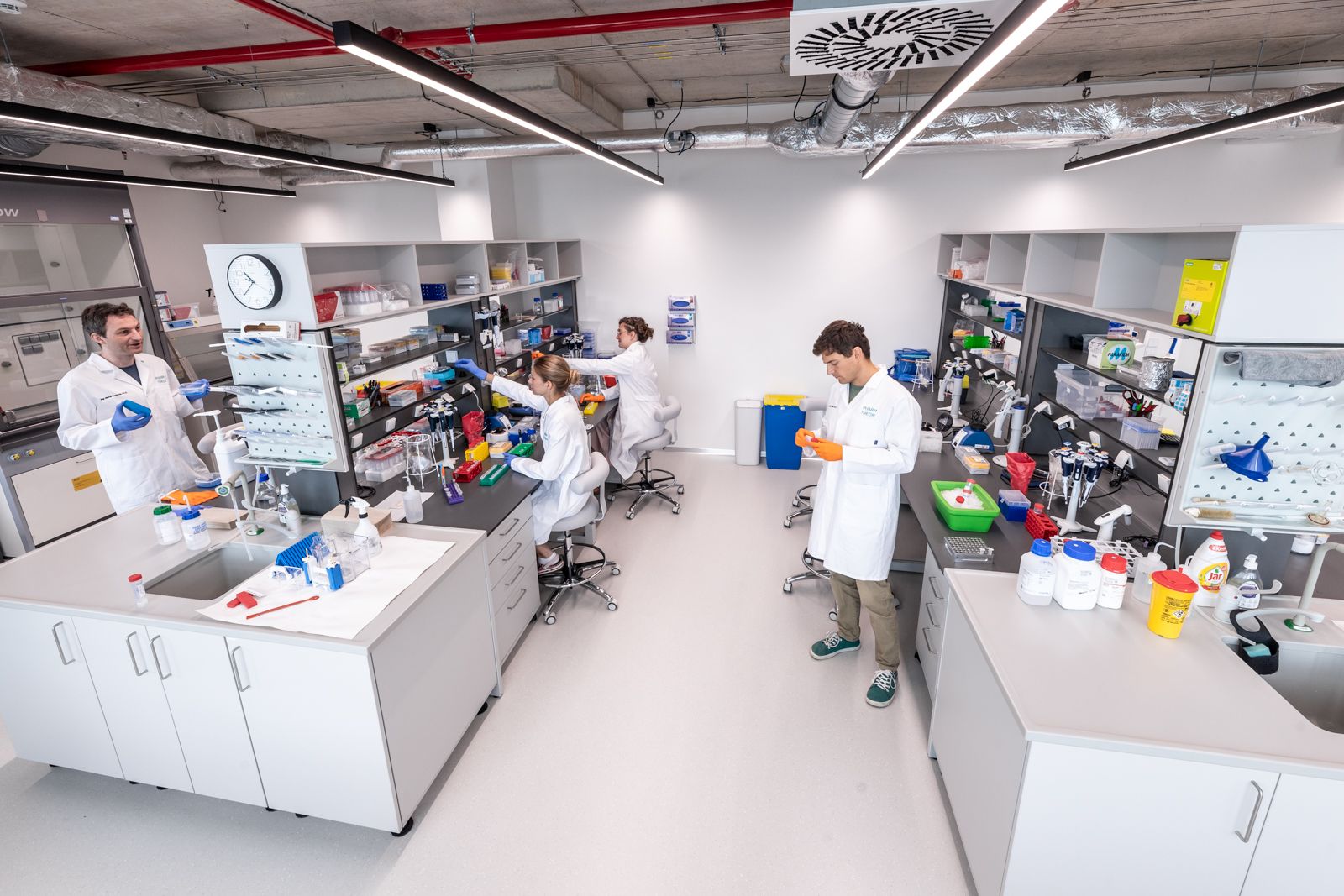 Laboratoře jsou vybaveny vlastním HVAC systémem s řízenou výměnou vzduchu a centrálními rozvody CO₂ a N2, což zajišťuje stabilní a bezpečné podmínky pro špičkový experimentální provoz.