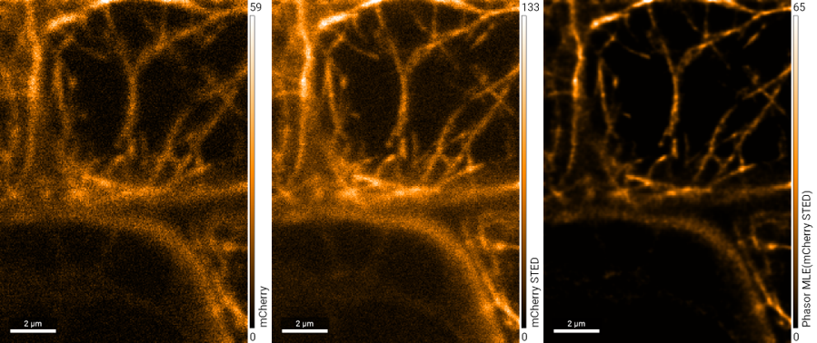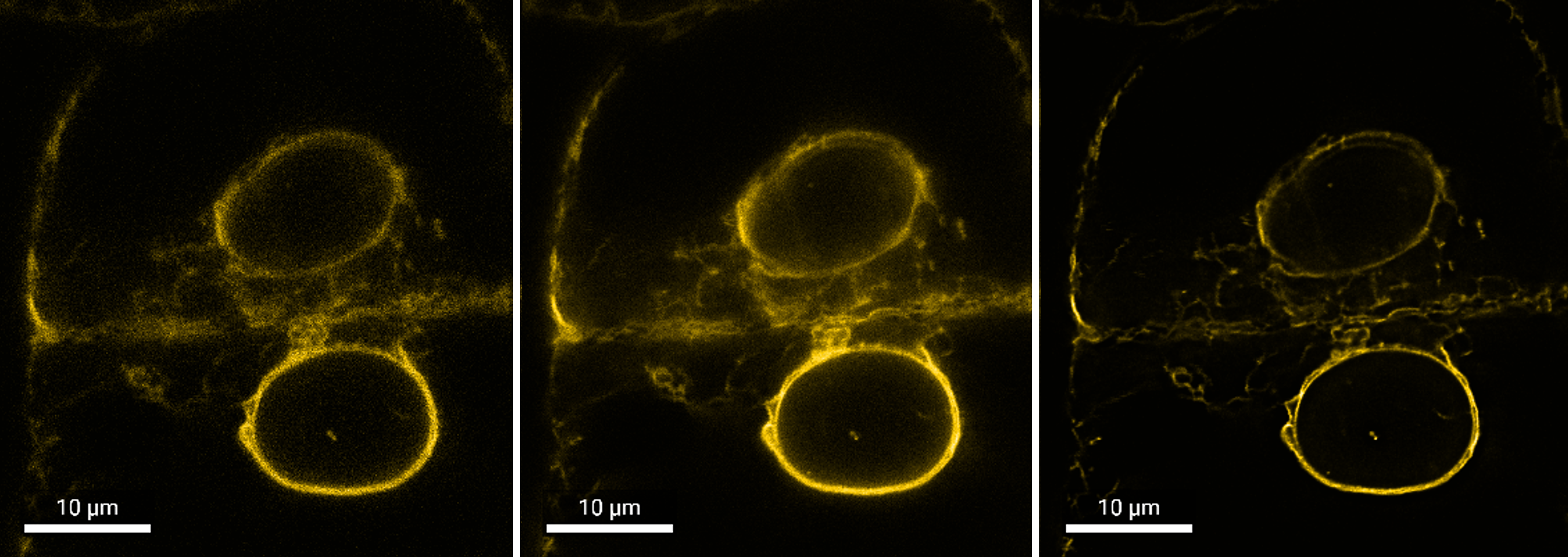 Rostlinné buňky s buněčnými jádry (dva kruhovité útvary). Snímek vlevo je pořízený běžnou konfokální mikroskopií, uprostřed superrezoluční mikroskopií, vpravo kombinací superrezoluční mikroskopie a techniky FLIM. Tato kombinace poskytuje tak kvalitní rozlišení, že lze od sebe zřetelně rozeznat dvě membrány tvořící obal buněčného jádra.