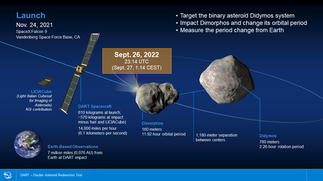 Today (September 27, 2022) at 1:14 AM CEST NASA’s Double Asteroid Redirection Test (DART) spacecraft successfully conducted the world’s first full-scale planetary defense test by impacting asteroid moonlet Dimorphos (Greek for “two forms”), which orbits a larger asteroid named Didymos (Greek for “twin”). The kinetic impact demonstrated one possible method of asteroid deflection technology. As a part of an international planetary defense strategy, the DART mission proved that a spacecraft can autonomously navigate to a target asteroid and intentionally collide with it to alter its orbit. DART is accompanied by a small Italian sub-spacecraft called LICIACube, which observed the impact from a distance.